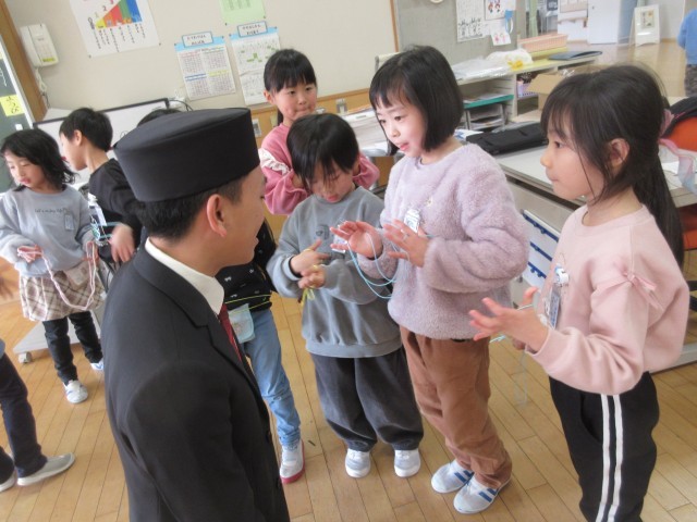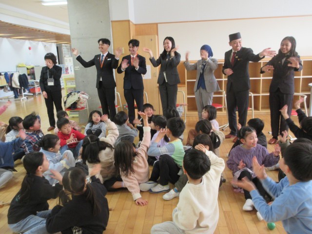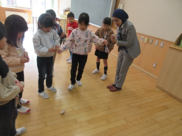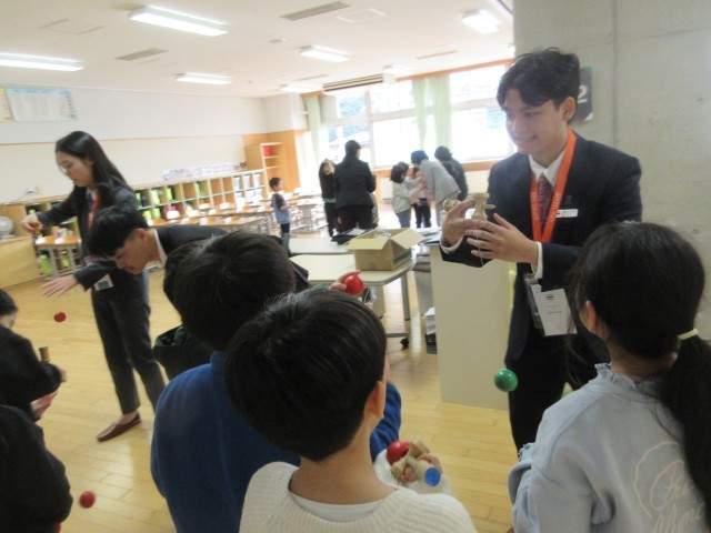 「東南アジア青年の船」事業に参加する東南アジアの方との交流会がありました。1年生は、日本の昔遊びを楽しみました。子供たちは、言葉は通じなくても、ジェスチャーを使うなど、何とかして伝えようと一生懸命関わっていました。技が成功するとハイタッチをして一緒に喜ぶ姿も見られました。