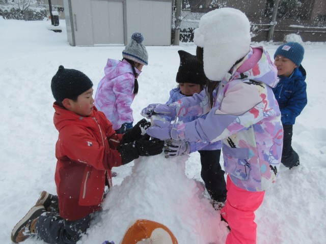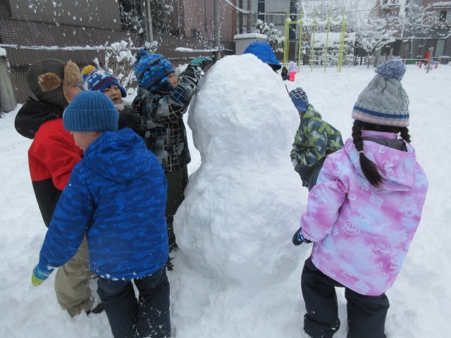 生活科「ふゆとなかよし」の学習で、雪遊びをしました。まず、雪の上を思いっきり走ってみました。子供たちは、雪の上を走るだけでとっても楽しそうにしていました。次に、団の友達と協力し合って雪のタワーを作り、タワーの高さを競争しました。最後の自由遊びでは、大きな雪だるまを作ったり、雪合戦をしたりして楽しみました。