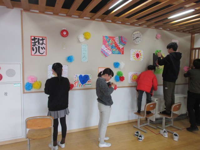5年生では、6年生さんの卒業に向けて、6年生教室や廊下の飾りつけを行いました。色々な作品や飾りを、全体のバランスを考えながら、協力して貼り付けていきました。華やかな教室や廊下を見て、6年生さんの喜ぶ姿を見るのが楽しみですね。