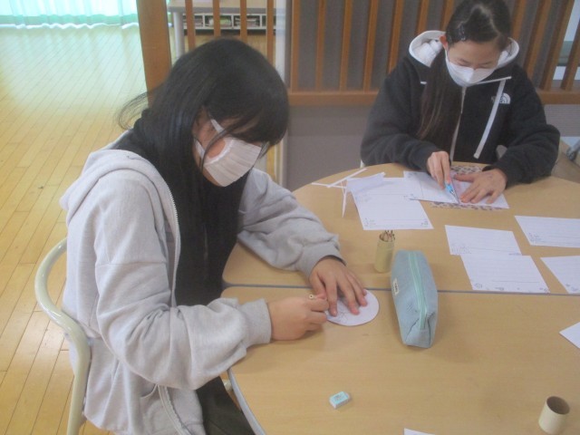 卒業プロジェクトの1つとして、今までお世話になった教職員の方々への感謝の手紙をつくっています。子供たちは、教職員の方々の似顔絵を描いたり、デザインを考えて型紙を作成したりするなど、教職員の方々に喜んでもらえる手紙になるように工夫をしています。心を込めて手紙をつくる活動を通して、子供たちは卒業への意識をさらに高めているようでした。