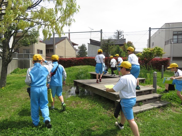 あたたかくなると自然がどんな様子になるのかを調べました。花や蝶を見つけてノートにメモしたり、写真を撮ったりしました。