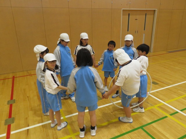 今日は体ほぐしの運動を行いました。ペアで背中合わせに立ち上がったり、グループでフラフープくぐりをしたりしました。互いに声を掛け合って協力して取り組む姿が見られました。
