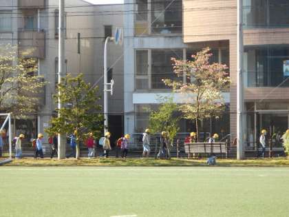 班長が1年生の歩き方を確かめながらの登校班です。いくつかの班は学校着が早いので、明日の町別児童会等で調整したいと考えています。