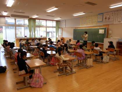 写真は、朝の健康観察を行っている1年生の様子です。名前を呼ばれると、しっかり大きな声で「元気です」と返事をしていました。