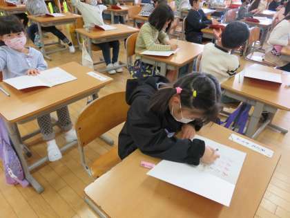 国語のノートに名前の練習をしました。見本の文字をなぞり書きした後、自分で書きました。