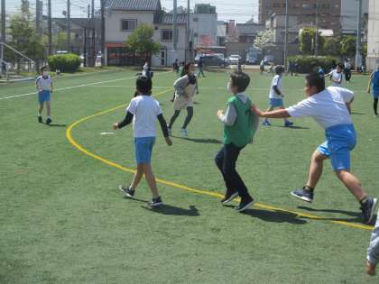 6年生はみんなでグラウンドに出て、けいどろを楽しみました。