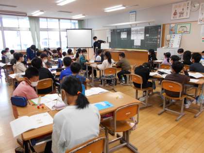 さて、左・中の写真は、3・5年生のグループ学習の様子です。モンシロチョウの幼虫の観察、地球儀と地図の比較をグループで行っています。友達の発見、考えのよさに気付いていきます。