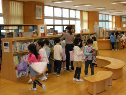 右は図書室で本を選ぶ1年生の様子です。マイバッグ持参で楽しそうに本を選んでいる姿は、りっぱな「中央っこ」です。