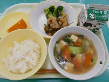 今日の献立は、ごはん、牛乳、豚肉と昆布の甘辛煮、ゆでブロッコリー、中華スープ、甘夏みかん です。