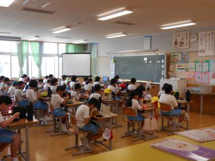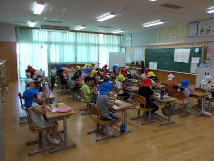お弁当中に、中学年までの集計が発表されました。1位赤団285点、2位黄団281点、3位青団262点、4位白団233点です。