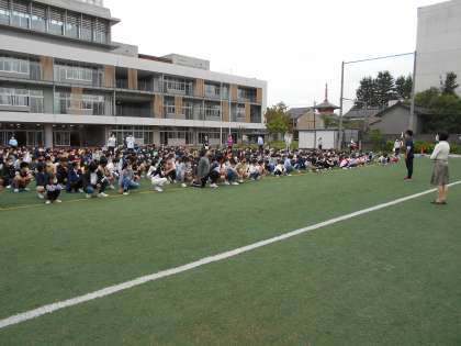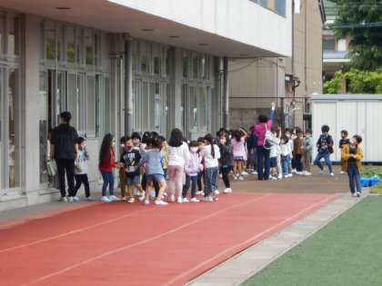 前回は放送を聞くだけでだったので、実際にグラウンドに避難するのは初めてです。1年生は最初少しざわついていましたが、先生の指示に従い静かに避難、集合していました。