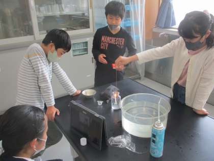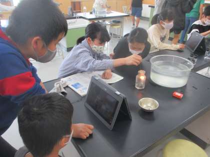 気体を入れた集気瓶にろうそくを入れると、火がすぐに消えたり、激しく燃えたりしました。その様子をクロームブックで撮影しました。