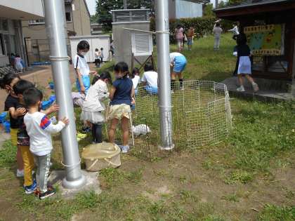 昨日のお昼は、「なかよしタイム」でした。外では、1年生の人気者のうさぎが外に出してもらい大喜びでした。係の子が読み聞かせを行っているクラスもありました。