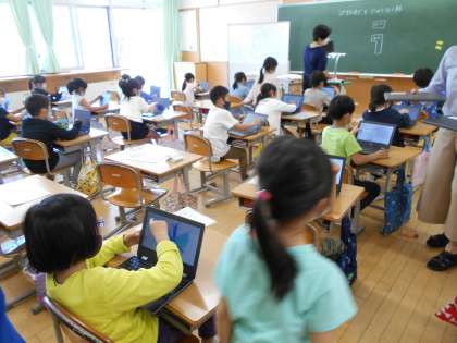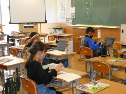 写真は一台端末の活動です。1年生はお絵かき(中)、5年生は社会科調べ活動(右)です。5年生は、図書による調べ活動も同時進行です。これはネット、これは図書と使い分けられたら、いろいろな場面で活きます。