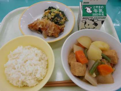 今日の献立は、ごはん、牛乳、魚の南蛮づけ、いり大豆和え、関東だき です。