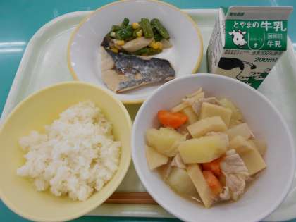 今日の献立は、ごはん、牛乳、鰆の塩焼き、アスパラソテー、じゃがいもと豚肉のみそ煮込み です。