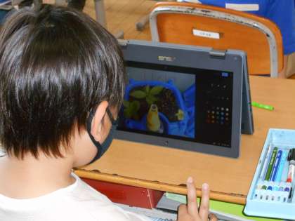 2年生が体育で「しっぽとりゲーム」を行い(中)、3年生が理科の栽培観察を自分の端末で行っていました(右)。