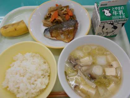 本日の献立は、さばのてりやき、くきわかめのきんぴら、とうふのみそしる、バナナです。