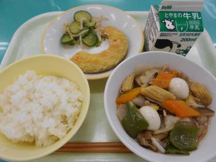 本日の献立は、はっぽうさい、かぼちゃのてんぷら、あまずあえ、です。