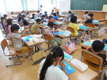 左は、1年生が図工で粘土遊びを行っている様子です。教室を覗くと、「このうさぎを見て!」「ぼくのは、へびだよ」と教えてくれます。