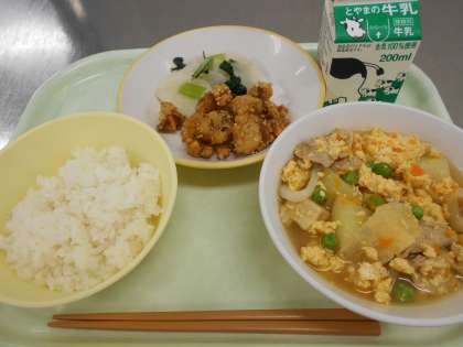 「かみかみ献立」として、カルシウムが多く含まれる食材を積極的に取り入れたメニューです。主菜には“大豆”、副菜には“小松菜、昆布”、卵とじには“高野豆腐”が入っています。