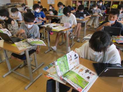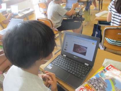 教科書や資料集で調べ学習を行い、自分の考えをノートとPCにまとめています。