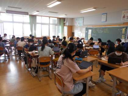 写真は、6年生が家庭科で「しつけ縫い」に挑戦する(中)、端末を使って社会科のグループ学習をする(右)様子です。