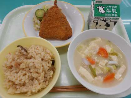 本日の献立は、ごもくごはん、アジフライ、きざみあえ、うちまめじる、です。