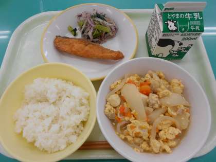 本日の献立は、さかなのたつたあげ、ゆかりあえ、おやこに、です。