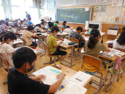 左の写真は、1年生が図工の粘土遊びの様子です。どうも料理メニューがテーマらしく、「昨日食べたギョウザをつくろう」「お寿司もいいな」と楽しそうでした。6年生は、国語のグループ発表への意見をクロムブックで伝えます(中)。4年生は、社会科で学んだ「水の行方」を絵や言葉でまとめていました(右)