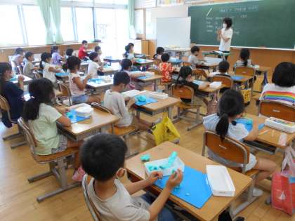 左の写真は、1年生が図工の粘土遊びの様子です。どうも料理メニューがテーマらしく、「昨日食べたギョウザをつくろう」「お寿司もいいな」と楽しそうでした。6年生は、国語のグループ発表への意見をクロムブックで伝えます(中)。4年生は、社会科で学んだ「水の行方」を絵や言葉でまとめていました(右)