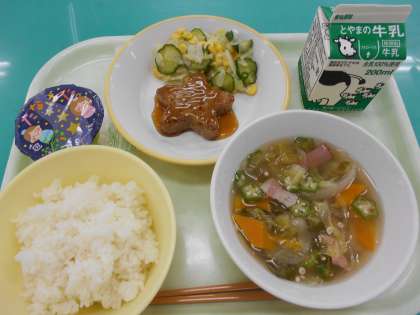 今日の献立は、ごはん、牛乳、星形ハンバーグ、コーンサラダ、天の川スープ、七夕ゼリー です。