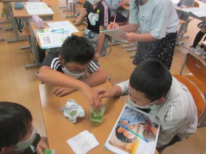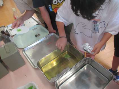 今日はたたき染めではなく、エタノールで葉を脱色する方法で、サツマイモの葉にでんぷんができたかどうかを確かめました。