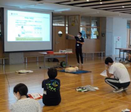 また昨日の放課後に、外部講師を招いて教員による救命救急法の講習会を行いました(中)。