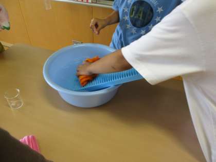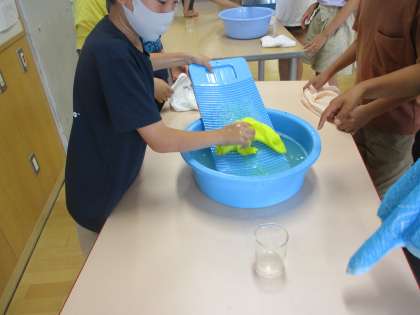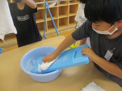 家庭科の学習で、洗濯板とたらいを使って、タオルを手洗いしました。