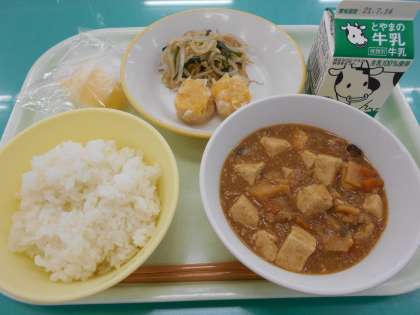 今日の献立は、ごはん、牛乳、マーボー豆腐、にんじんシューマイ、ナムル、冷凍りんご です。