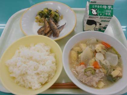 本日の献立は、こあじのからあげ、チンゲンサイひたし、ぶたじる、です。