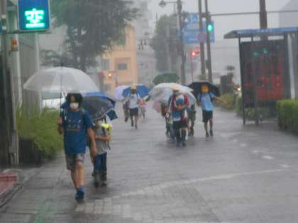「いたち川が大変なことになっていたよ」と教えてくれた9日(金)の朝です。時折激しい雨に、子供たちは傘をさして頑張って登校していました。
