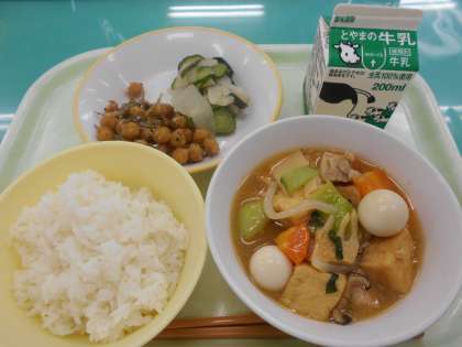 今日の献立は、ご飯、牛乳、厚揚げの中華煮込み、小魚入りフライビーンズ、酢の物 です。