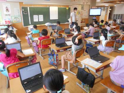 2年生は、クロムブックで家庭学習強化週間の取組を入力していました(右)。取組を振り返り、次回にしかしたいです。