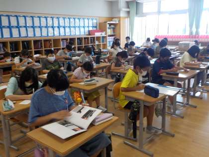 今日は2学期の目当てを考えたり、夏休み自由研究の作品カードを書いたりしました。