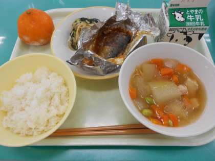 本日の献立は、さばのぎんがみやき、はりはりあえ、とうがんのよしのに、れいとうみかん、です。
