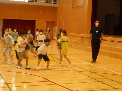 体育館は、前半5年生、後半4年生の使用です。カメラを構えると、なんとALTのデュラン先生まで楽しんでいました。