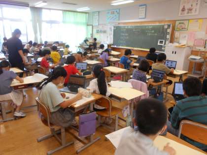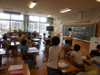 3年生では校区の自慢を探す授業(中)が、4年生ではオリンピックを取り上げた作品に挑戦する授業が行われていました(右)。