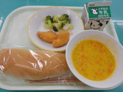 今日の献立は、コッペパン、牛乳、チキンナゲット、フレンチサラダ、かぼちゃポタージュ です。