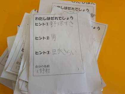 なかよしタイムに、ゲーム係が中心となり、「わたしはだれでしょう」ゲームをしました。3つのヒントを聞けば、だれのことであるかをすぐに当てていました。さすがクラスメートです。