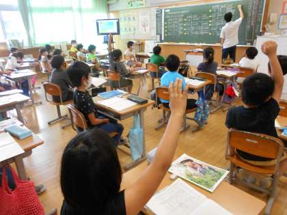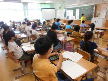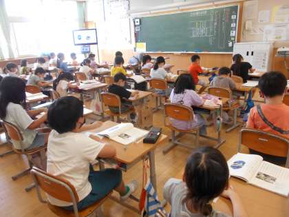 学校を巡回すると、2年生が国語の説明文の解読(左)に、3年生が昆虫の生態(中)を5年生が計算方法の最善策(右)を、学級のみんなで取り組んでいました。