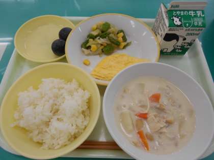 今日の献立は、ごはん、牛乳、オムレツ、アスパラサラダ、白いんげん豆のシチュー、巨峰 です。