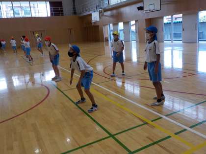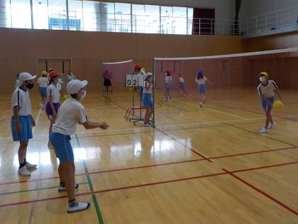 9月24日(金)、体育科では「キャッチバレーボール」をしています。「三回つないで相手コートに返すと3点が入る」というルールのもと、子供たちはレシーブ、キャッチ(トス)、アタックまでのプレーをできるようにチームで練習しています。