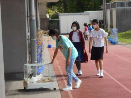 最近、委員会の子供たちがウサギの日向ぼっこをさせに連れ出しているようです。